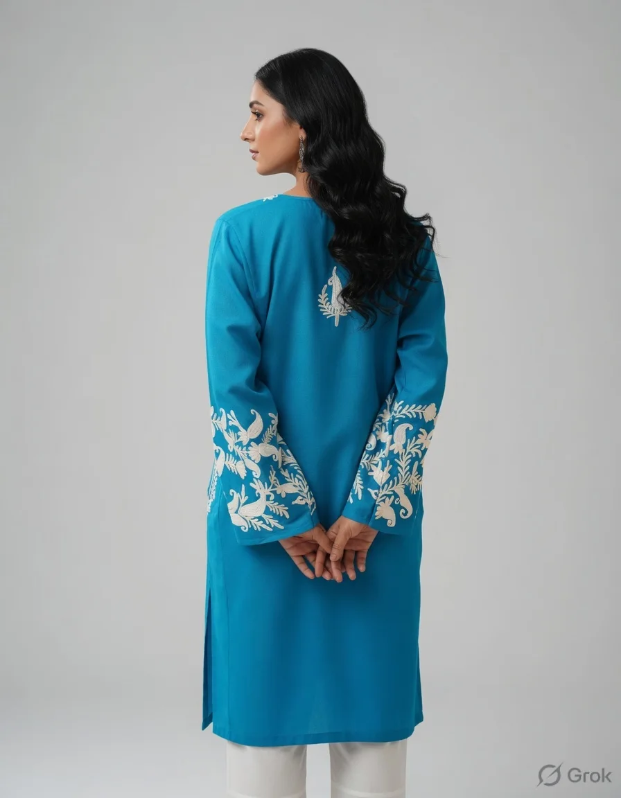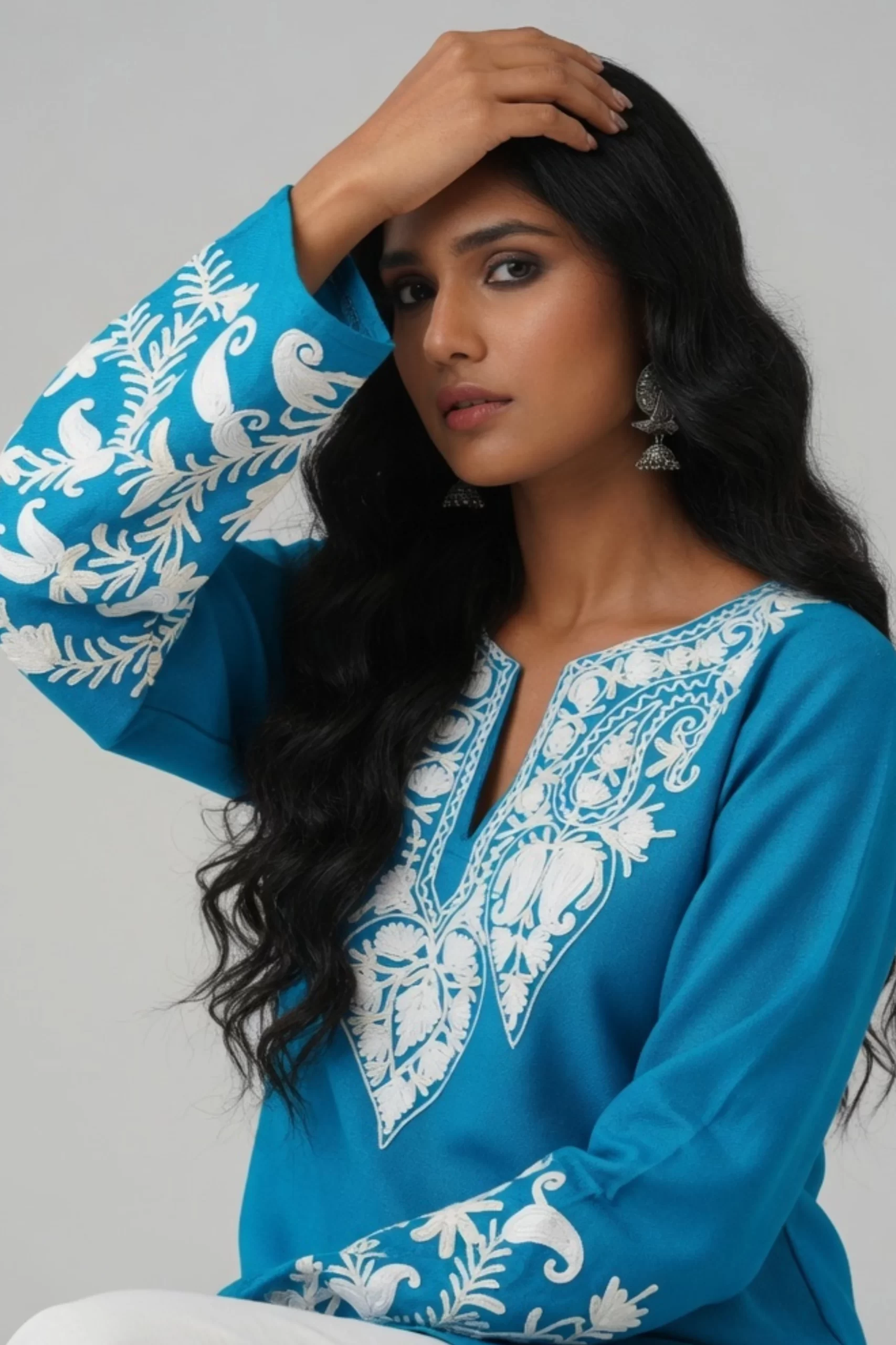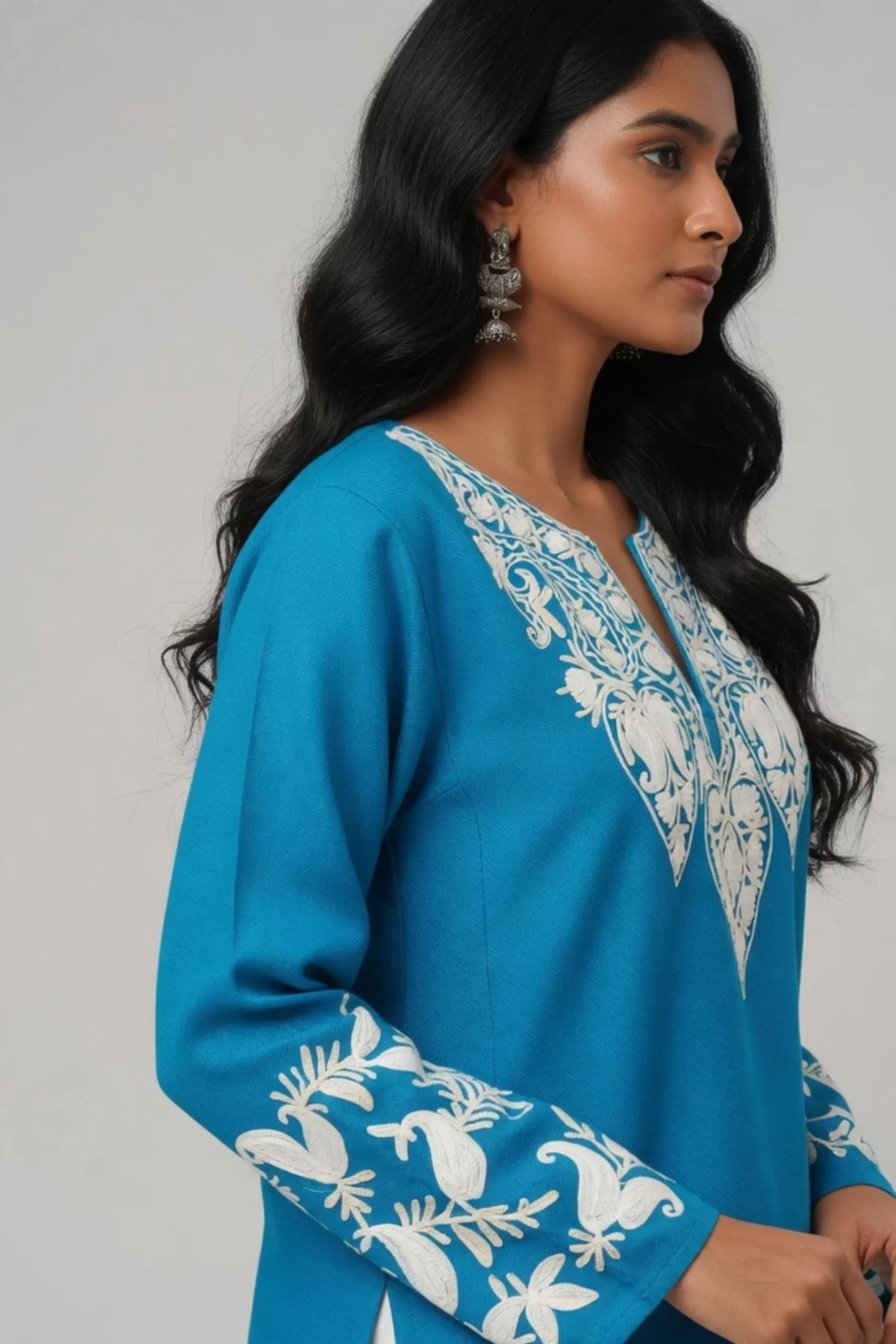 This beautiful phiran highlights the artistry of Kashmiri Aari embroidery. The lovely turquoise sky blue base contrasts beautifully with the delicate cream Aari threads, making it truly memorable. The intricate embroidery on the sleeves and front hemline adds depth and significance to the outfit. Each stitch is carefully placed, creating fine lines and subtle textures that bring the design to life.